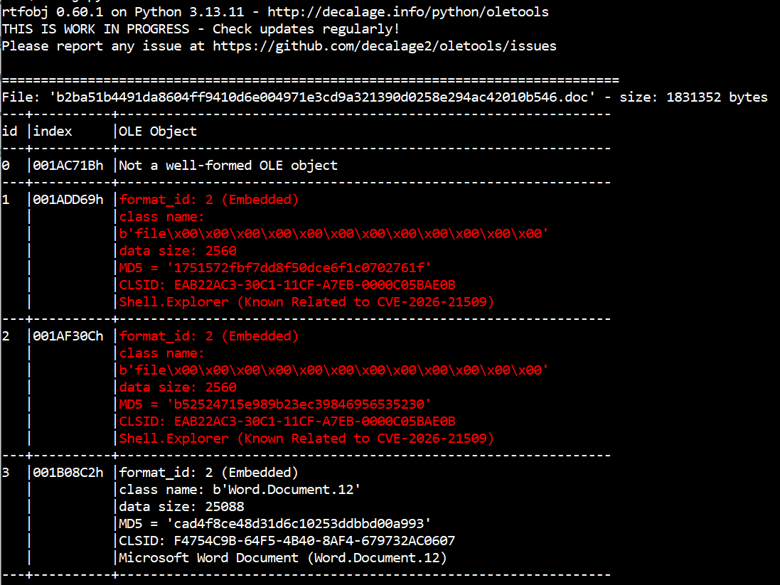 Important: this script can be used to hunt and analyse suspicious files in an attempt to identify CVE-2026-21509 samples, but it is by no means a foolproof detection method as it may catch other documents not related to the vulnerability.