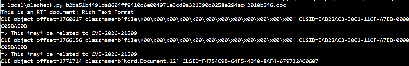 Important: this script can be used to hunt and analyse suspicious files in an attempt to identify CVE-2026-21509 samples, but it is by no means a foolproof detection method as it may catch other documents not related to the vulnerability.